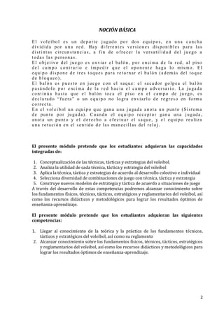 El módulo formativo sobre fundamentos técnicos, tácticos y estratégicos del voleibol tiene como objetivo que los estudiantes adquieran competencias en la conceptualización y aplicación de las técnicas y estrategias del deporte. Se enfatiza la importancia de integrar conocimientos teóricos y prácticos, así como metodologías de enseñanza para mejorar la educación en voleibol. Además, aborda la necesidad de fomentar su práctica en contextos educativos para contribuir a una vida saludable.