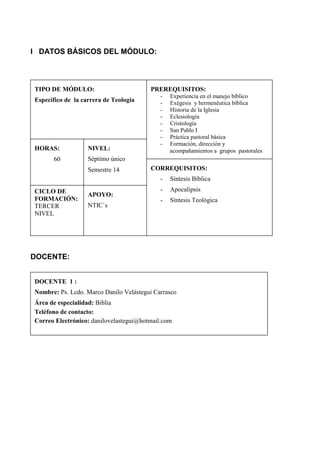 Este documento presenta la información sobre el módulo "San Pablo II" del seminario mayor "Cristo Sacerdote". El módulo contiene secciones sobre datos básicos, ruta formativa, metodología, evaluación, guías y bibliografía. La metodología se centra en el aprendizaje autónomo y la lectio divina para analizar las cartas de San Pablo a la luz de problemas actuales.