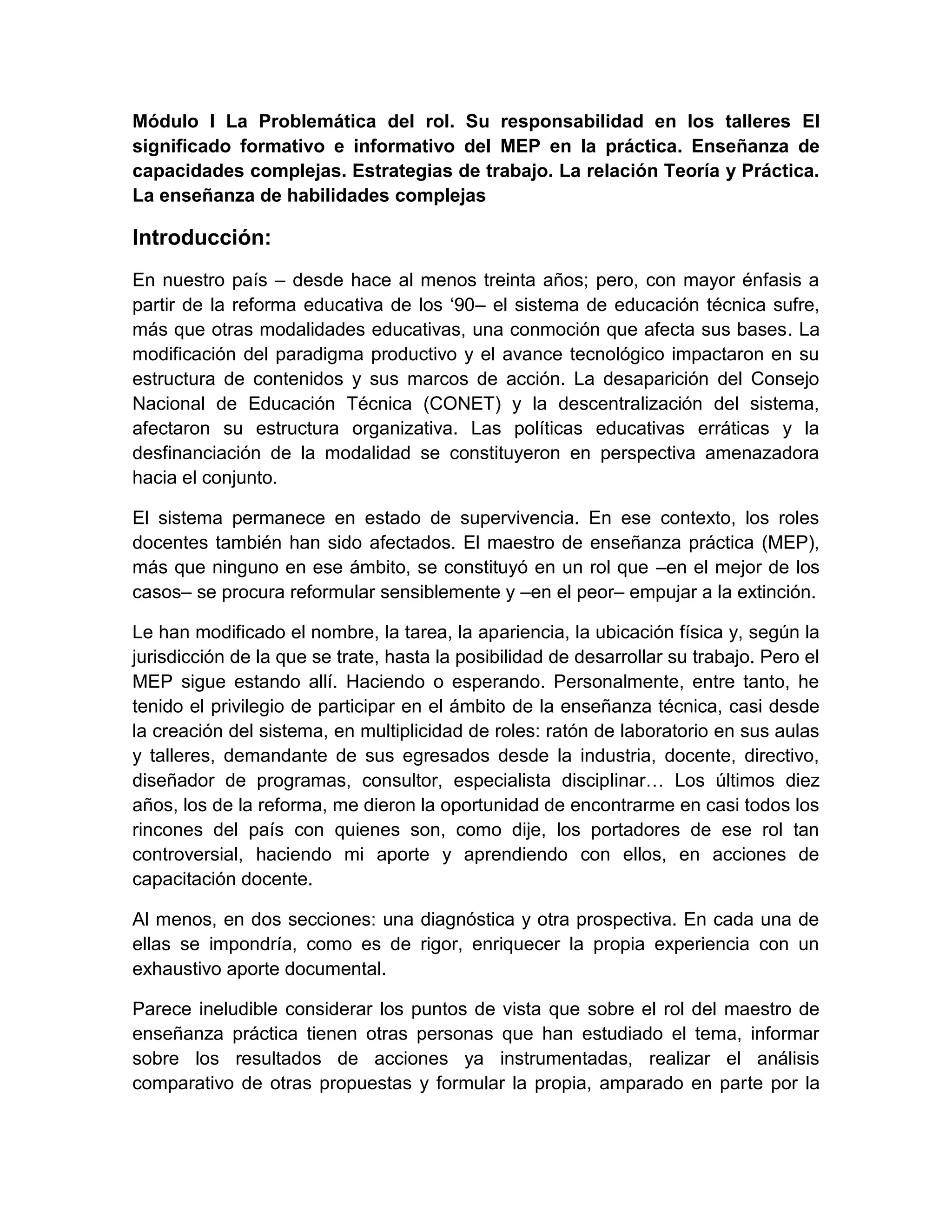 Este documento discute la importancia de los talleres y la carga horaria de los maestros de enseñanza práctica en las escuelas técnicas. Argumenta que los talleres son un elemento clave para la formación de técnicos competentes, y que reducir su carga horaria pone en riesgo la calidad de la enseñanza técnica. También resalta la responsabilidad que tienen los docentes técnicos de asegurar que los estudiantes salgan debidamente capacitados para ejercer su profesión de manera segura.
