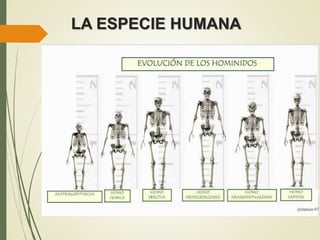 El documento aborda la evolución de la especie humana desde sus ancestros hasta el Homo sapiens sapiens, analizando características físicas y comportamentales. También se discuten las formas de organización social y los agentes de socialización, así como los impactos ambientales de las actividades humanas y el concepto de desarrollo económico y sostenible. Se concluye resaltando la importancia de una relación armónica entre el hombre y la naturaleza para el bienestar futuro.