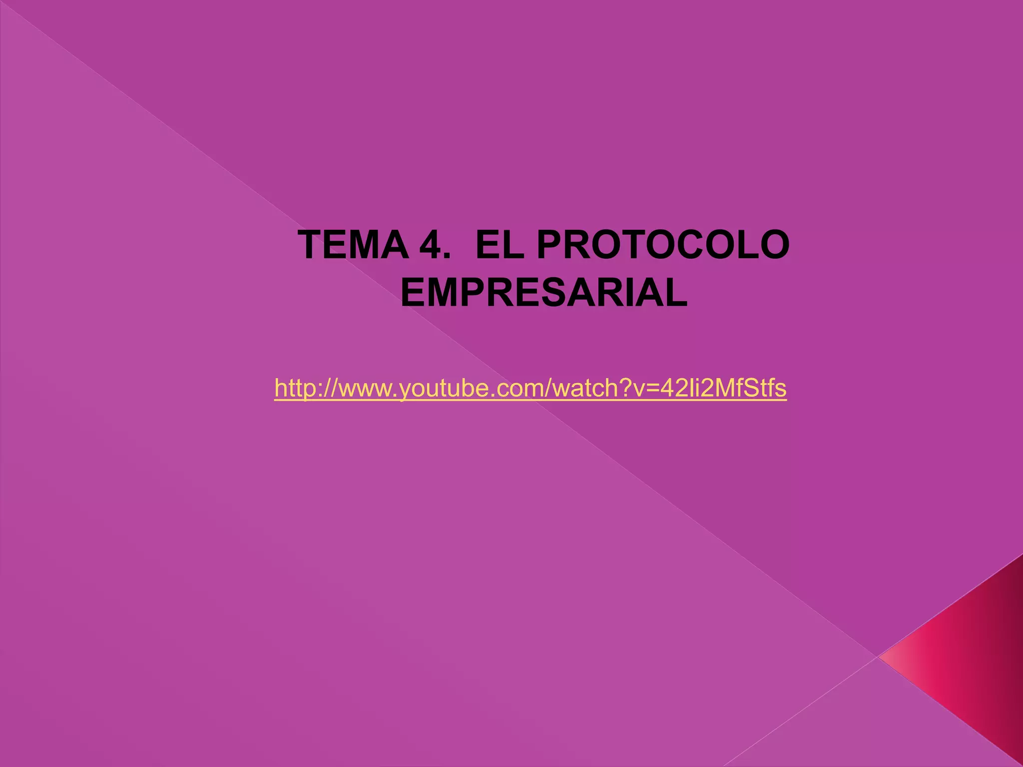 Este documento trata sobre el protocolo empresarial y contiene información sobre: 1) los tratamientos dentro de la empresa y la recepción de visitas; 2) el restaurante como parte de la oficina y las normas de precedencia; 3) el regalo y la etiqueta en la empresa. Además, explica la ubicación correcta de símbolos como banderas e himnos, y la importancia de la imagen corporativa y el manual de protocolo de una empresa.