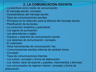 El documento habla sobre la comunicación escrita en el ámbito empresarial. Explica los tipos de comunicaciones escritas, los principios de redacción, la planificación de textos y corrección. También cubre los equipos y sistemas de comunicación escrita como el ordenador y fax. Por último, describe los documentos administrativos básicos como cartas, circulares, notas y actas.