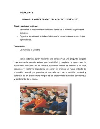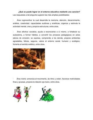 Este documento describe la importancia de la música en el contexto educativo. Resalta que la música puede desarrollar áreas cognitivas, afectivas y motrices del individuo de manera integral. Explica que la música funciona mejor cuando se usa un método que aprovecha sus beneficios de manera adecuada y práctica mediante el desarrollo de habilidades como la apreciación musical, la formación vocal e instrumental, y el lenguaje musical.