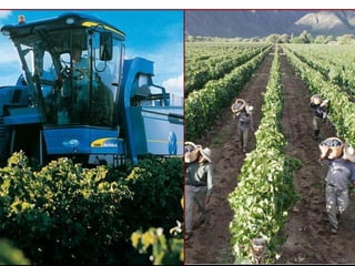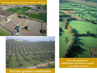 El documento describe diferentes tipos de parcelas agrícolas, cultivos y sistemas de agricultura. Explica que las parcelas pueden variar en forma, tamaño y límites, y que los cultivos incluyen plantas de ciclo anual y árboles. También describe sistemas de monocultivo y policultivo, riego y ganadería extensiva e intensiva, así como diferencias en paisajes agrarios entre países desarrollados y en desarrollo.