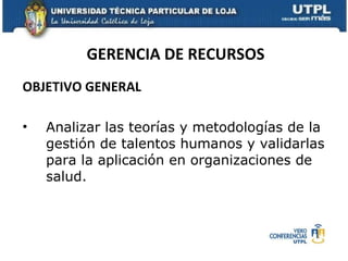 Este documento presenta un módulo sobre la gerencia de recursos humanos en una escuela de medicina. El módulo analiza las teorías y metodologías de la gestión de talentos humanos y su aplicación en organizaciones de salud. El contenido incluye unidades sobre las personas en las organizaciones, la provisión de recursos humanos, la evaluación del desempeño y la higiene y seguridad en el trabajo. El objetivo es comprender la importancia de conocer al personal y lograr un desempeño eficaz a través de la gestión adec