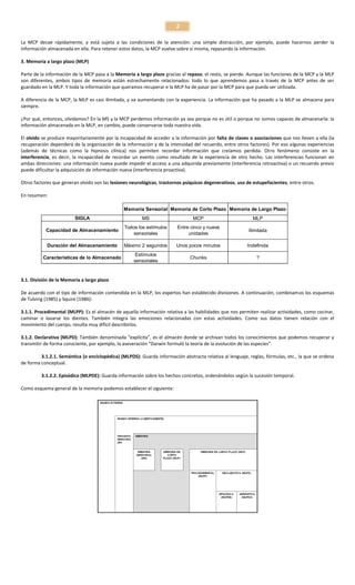 Este documento presenta un resumen de los principales procesos cognitivos relacionados con la memoria según el modelo estructural de Atkinson y Shiffrin. Explica que la memoria está dividida en memoria sensorial, memoria a corto plazo y memoria a largo plazo. La memoria sensorial almacena información por breves períodos, la memoria a corto plazo por unos minutos, y la memoria a largo plazo de forma indefinida. Además, la memoria a largo plazo se divide en procedimental, semántic