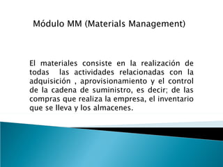 El documento describe el módulo MM (Materials Management) de un sistema de administración de empresas, el cual se encarga de las actividades relacionadas con la adquisición, aprovisionamiento y control de la cadena de suministro de una empresa. El módulo incluye componentes para el intercambio electrónico de datos, planificación de necesidades, compras, gestión de inventario, verificación de facturas y gestión de almacenes. Además, almacena información maestra sobre los materiales individuales y descripciones que una empresa obtiene, produce y gestiona en