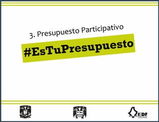 El documento habla sobre la participación ciudadana y el presupuesto participativo. Explica que el presupuesto participativo permite que los ciudadanos decidan cómo gastar el 3% del presupuesto público de cada delegación a través de proyectos sociales. Los vecinos proponen proyectos para mejorar su colonia y luego votan para elegir qué proyecto se llevará a cabo con el dinero asignado.