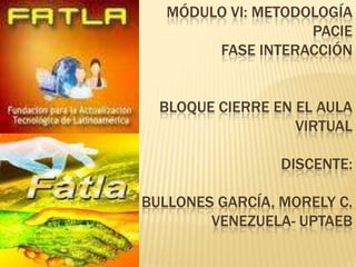 Este documento describe la importancia del bloque de cierre dentro de un aula virtual. Explica que el bloque de cierre permite la autoevaluación, negociación y retroalimentación entre el tutor y los participantes. También permite despedirse, entregar certificados de graduación y calificar el curso completo.