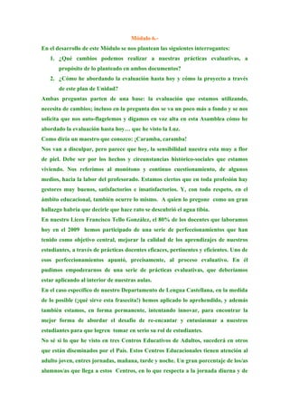 Este documento discute varios temas relacionados con la evaluación en la educación de adultos. Señala que la evaluación actual necesita cambios y propone prácticas de evaluación efectivas como la retroalimentación constante. También analiza los desafíos de motivar a los estudiantes adultos y lograr que valoren la importancia de los aprendizajes. Finalmente, concluye que la evaluación es un tema complejo en este contexto y que los maestros deben entender las diferencias individuales de los estudiantes.