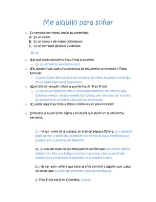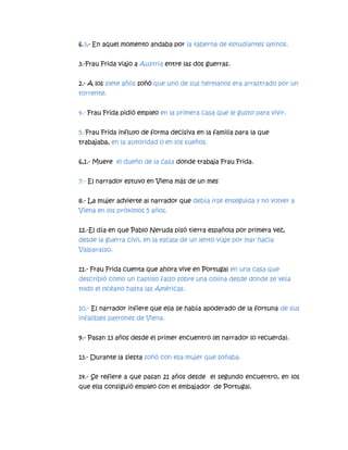 El documento resume la historia de Frau Frida, una mujer colombiana que trabajó como ama de llaves en Viena entre las guerras mundiales. El narrador la conoció hace 34 años y la volvió a encontrar 13 años después. Frau Frida predijo eventos del futuro y parecía tener influencia sobre las familias para las que trabajaba. Finalmente consiguió empleo con el embajador de Portugal, donde vivió hasta fallecer en un accidente automovilístico.