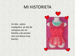 La historia trata sobre una niña que ve una blusa que le gusta en $90 pero sus padres no se la compran porque el precio es alto. La niña se enoja pero luego entiende que no era necesario. Meses después, sus padres le compran unas zapatillas bonitas para compensarla.