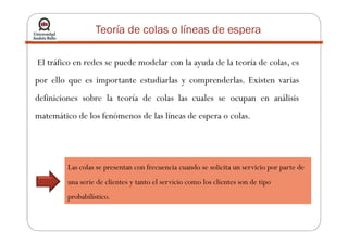 La teoría de colas describe sistemas de líneas de espera mediante modelos matemáticos. Se utiliza para modelar el tráfico en redes. Algunos modelos comunes incluyen M/M/1, con llegadas de Poisson y tiempos de servicio exponenciales para un solo servidor. El objetivo es determinar el estado estable del sistema y la capacidad de servicio apropiada.