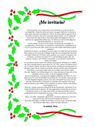 Jesús se queja de que aunque se celebra su cumpleaños, él no es realmente invitado o incluido en las fiestas. Él espera con ansias ir a la casa del destinatario para ser tratado como un rey e invitado de honor. Jesús agradece al destinatario por reunir a su familia el 24 de diciembre para recordar que ese día Jesús nació para salvarles.