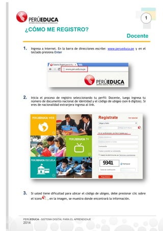 El documento proporciona instrucciones en 11 pasos para registrarse en el Sistema Digital para el Aprendizaje PerúEduca como docente. El registro requiere ingresar el número de DNI, código de ubigeo, correo electrónico, contraseña y aceptar los términos y condiciones. Luego se deben completar formularios con datos personales, académicos e institucionales, presionando los botones AGREGAR y FINALIZAR para guardar la información. Una vez registrado, el usuario podrá acceder a los recurs