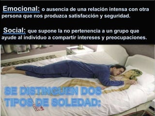 La soledad se ha convertido en una gran preocupación para los psicólogos en el siglo XXI. Se define como la ausencia de una relación profunda con otra persona y puede dividirse en soledad emocional y social. La soledad no deseada puede ser perjudicial para la salud mental y emocional. Para combatir la soledad, el documento recomienda hablar con otros sobre tus sentimientos diariamente, no buscar refugios como el alcohol, y mantenerse ocupado en lugar de preocuparse por la sensación de soledad.