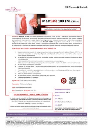 MeatSafe 100 TM es un aditivo alimentario que reduce la contaminación bacteriana en carnes rojas aplicado antes o después del refrigerado. Es efectivo contra E. coli y otras bacterias sin afectar el sabor. Se aplica fácilmente en aerosol o inmersión manteniendo un pH entre 2.5-2.9 para cumplir los estándares de seguridad alimentaria.