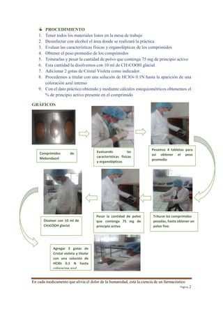 Este documento describe una práctica de laboratorio realizada por estudiantes de bioquímica y farmacia para verificar la concentración de principio activo (mebendazol) en un comprimido genérico a través de titulación ácido-base. Los estudiantes midieron un 110.12% de mebendazol, dentro de los parámetros de referencia, validando el método. El objetivo era garantizar la calidad del medicamento y su efectividad para tratar parásitos intestinales.