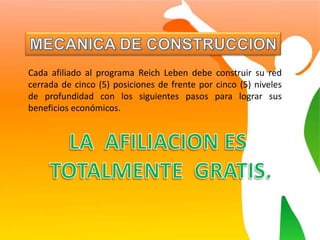 El documento describe los pasos para construir una red de cinco posiciones por cinco niveles a través del programa Reich Leben. Los pasos incluyen registrarse en el sitio web, seleccionar cinco invitados iniciales, ayudar a que cada uno de ellos obtenga cinco invitados, y continuar liderando a los miembros para construir tres niveles más, lo que resulta en una red comisionable de cinco posiciones por cinco niveles.
