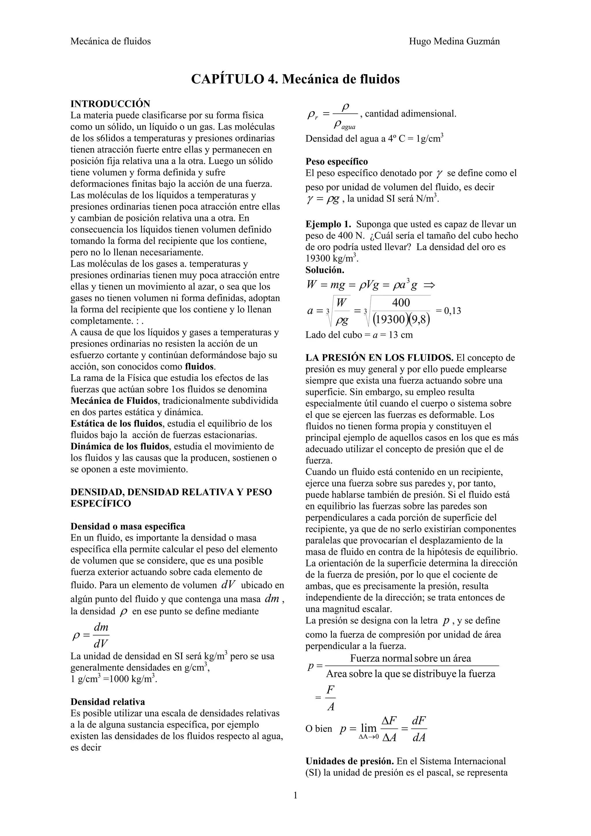 Este documento introduce los conceptos básicos de la mecánica de fluidos. Explica que los fluidos son sustancias que no resisten fuerzas cortantes y adoptan la forma de su contenedor. Describe la densidad, densidad relativa y peso específico de los fluidos. También define la presión en un fluido y cómo varía la presión con la profundidad. Por último, presenta el principio de Pascal sobre cómo los cambios de presión se transmiten a través de un fluido confinado.