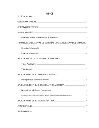 Este documento describe las aplicaciones de la ecuación de Bernoulli en la industria química, incluyendo sistemas de bombeo, tubos piezométricos, tubos Venturi y más. Explica conceptos como presión estática, dinámica y de estancamiento. Luego detalla cómo se usa la ecuación de Bernoulli en procesos industriales, la industria minera, farmacéutica y agroindustria.
