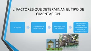 Este documento presenta un trabajo de investigación sobre cimentaciones y taludes realizado por una estudiante. Incluye factores que determinan el tipo de cimentación, clases de cimentaciones profundas como pilotes, consideraciones sobre el contacto suelo-estructura, cimentaciones en diferentes tipos de suelo como arcillas, rocas y taludes, y factores que afectan la estabilidad de taludes. El documento proporciona información técnica detallada sobre diversos temas relacionados con cimentaciones y suelos.