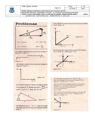 Este documento describe un taller sobre álgebra vectorial en física para el grado 3-VII. El objetivo del taller es reforzar las propiedades y leyes básicas de la mecánica vectorial y practicar el uso de propiedades y fórmulas para resolver problemas propuestos.