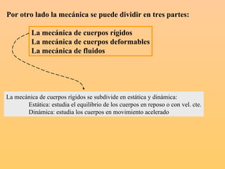 La mecánica describe el movimiento de los cuerpos bajo la acción de fuerzas y se divide en tres partes: mecánica de cuerpos rígidos, mecánica de cuerpos deformables y mecánica de fluidos. El Sistema Internacional de Unidades es el sistema estándar de unidades que se usa en la mayoría de países y se basa en las unidades de metro, kilogramo y segundo. La metrología es la ciencia que estudia y aplica la medición de cantidades físicas.