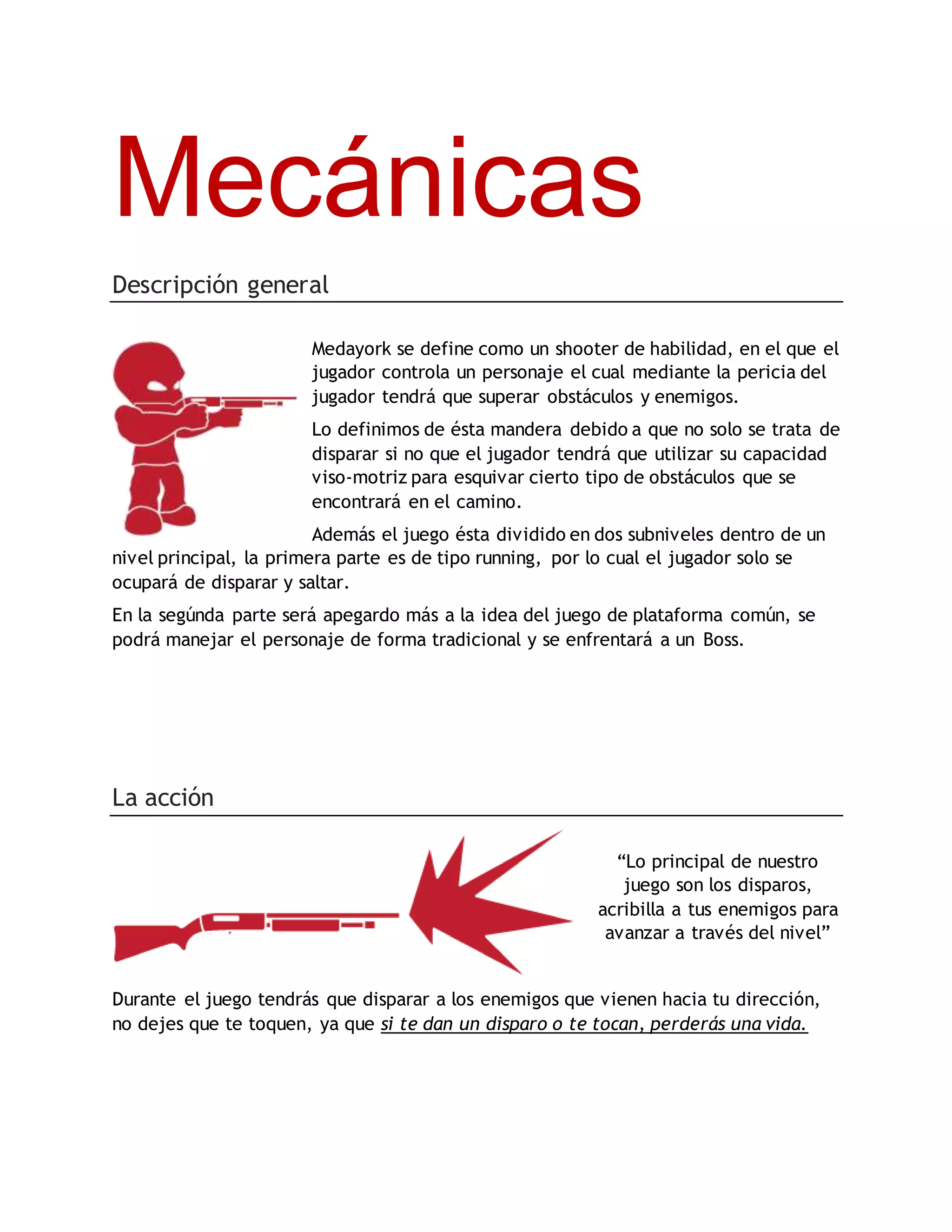 Medayork es un juego shooter de habilidad en el que los jugadores controlan un personaje que debe superar obstáculos y enemigos utilizando su destreza visomotriz. El juego está dividido en dos subniveles por nivel: la primera parte requiere disparar y saltar mientras corres, y la segunda parte es más como un juego de plataforma tradicional donde se enfrenta a un jefe al final.