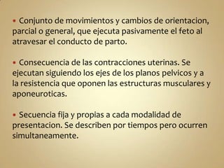 El documento describe los 10 tiempos del mecanismo de parto en la presentación de vértice y en la podálica. En la presentación de vértice, la cabeza fetal se acomoda y desciende a través de los estrechos pélvicos mediante rotaciones y flexionamientos. En la podálica, son las nalgas las que se acomodan primero, seguidas por los hombros y finalmente la cabeza a medida que el feto desciende. El documento también describe posibles perturbaciones en cada tiempo de ambos mecanismos.