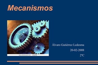 Los mecanismos son elementos que transmiten y transforman fuerzas y movimientos, permitiendo realizar tareas con mayor comodidad y menor esfuerzo. Se clasifican en mecanismos de transmisión lineal como la palanca y poleas, mecanismos de transmisión circular como engranajes y poleas con correa, y mecanismos de transformación de movimiento como piñones y cremalleras. Estos mecanismos transmiten fuerzas y permiten variar la velocidad de movimiento.