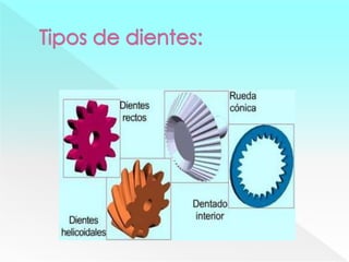 El documento describe diferentes mecanismos para transformar movimientos, incluyendo levas, engranajes, tornillos y poleas. Explica cómo las palancas, poleas simples y de polipasto pueden reducir la fuerza necesaria para realizar una tarea. También cubre mecanismos como la biela-manivela y excéntrica que transforman movimientos de rotación a lineales y viceversa.