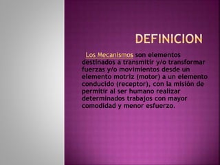 Este documento describe diferentes tipos de mecanismos, incluyendo palancas, tornillos, poleas, ruedas dentadas y otros. Explica cómo estos mecanismos pueden modificar la fuerza, la velocidad y el movimiento aplicando principios físicos básicos. También proporciona detalles sobre cómo funcionan mecanismos específicos como palancas, tornillos, ruedas excéntricas y poleas, transformando movimientos rotatorios en lineales o multiplicando fuerzas aplicadas.