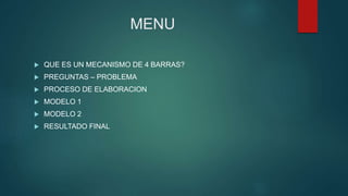 Este documento describe un mecanismo de cuatro barras, el cual consiste en tres barras móviles y una cuarta barra fija unidas por articulaciones. Explica que para que el movimiento entre las barras sea continuo, la suma de la barra más corta y la barra más larga no puede ser mayor que la suma de las barras restantes. Además, detalla el proceso de elaboración de dos modelos prácticos de este mecanismo usando palos de balsa y tornillos.