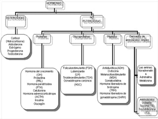 Este documento clasifica las hormonas en hidrosolubles y liposolubles, y describe sus mecanismos de acción. Las hormonas hidrosolubles se almacenan en vesículas y se liberan por exocitosis a la sangre, mientras que las liposolubles no se almacenan y se liberan por difusión. Las hormonas hidrosolubles tienen receptores en la membrana celular, mientras que las liposolubles suelen tenerlos en el citoplasma y núcleo, aunque a veces también en la membrana.