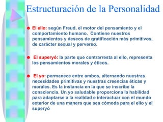 Este documento describe los principales mecanismos de defensa del yo según el psicoanálisis de Freud. Explica que el yo se encuentra entre el ello, que contiene los deseos primitivos, y el superyó, que representa la moral. Luego, detalla las etapas del desarrollo psicosexual y los mecanismos de defensa asociados a cada una, como también los tipos de personalidad que pueden derivar de fijaciones en dichas etapas. Finalmente, explica en detalle diferentes mecanismos de defensa como la repres