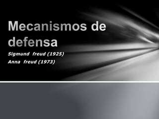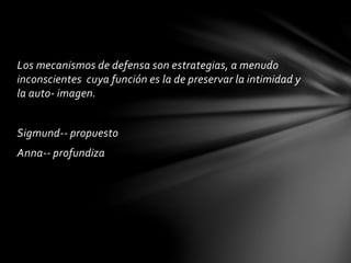 Los mecanismos de defensa son estrategias inconscientes que preservan la intimidad y autoimagen. Sigmund Freud propuso varios mecanismos como la proyección, negación, distorsión y represión. Anna Freud profundizó el estudio de mecanismos como la introyección, desplazamiento y sublimación. Los mecanismos pueden ser narcisistas, neuróticos, maduros o inmaduros y sirven para reducir la ansiedad aunque a veces lo hacen a costa de esfuerzo mental.
