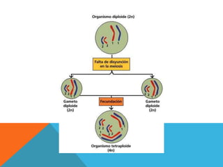 El documento describe los diferentes tipos de especiación, incluyendo la especiación primaria que ocurre cuando poblaciones de una especie se dividen en dos o más nuevas especies debido a condiciones ambientales distintas, y la especiación secundaria que ocurre por hibridación entre dos especies formando una nueva. También discute los conceptos de aislamiento reproductivo, poliploidía, autofecundación y adaptación, los cuales juegan un papel importante en la formación de nuevas especies.