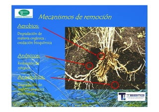 El documento describe los principales mecanismos de remoción de contaminantes en sistemas de tratamiento de aguas residuales, incluyendo la degradación de la materia orgánica a través de procesos aerobios, anóxicos y anaerobios; la filtración y precipitación de sólidos suspendidos; y la solubilización y asimilación de nutrientes como el nitrógeno y el fósforo a través de procesos bacterianos y de las plantas. También se mencionan los mecanismos de remoción de metales pesados