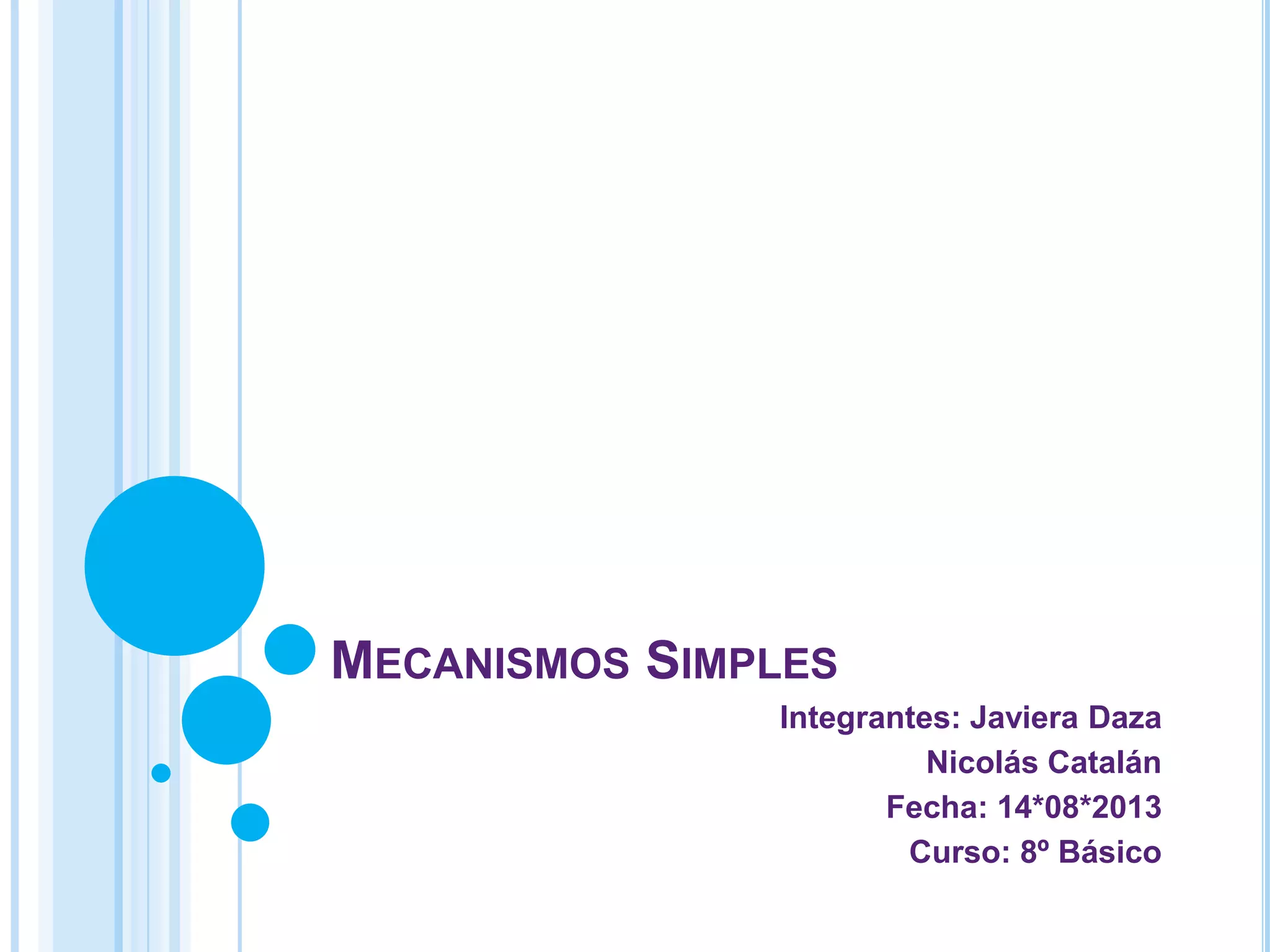 Este documento resume los conceptos básicos de los mecanismos simples como poleas y engranajes. Explica que los mecanismos permiten transmitir energía y reducir esfuerzo al mover objetos pesados mediante el movimiento relativo de sus elementos. Describe cómo las poleas facilitan el levantamiento de peso y los engranajes transmiten potencia entre componentes de una máquina usando ruedas dentadas.