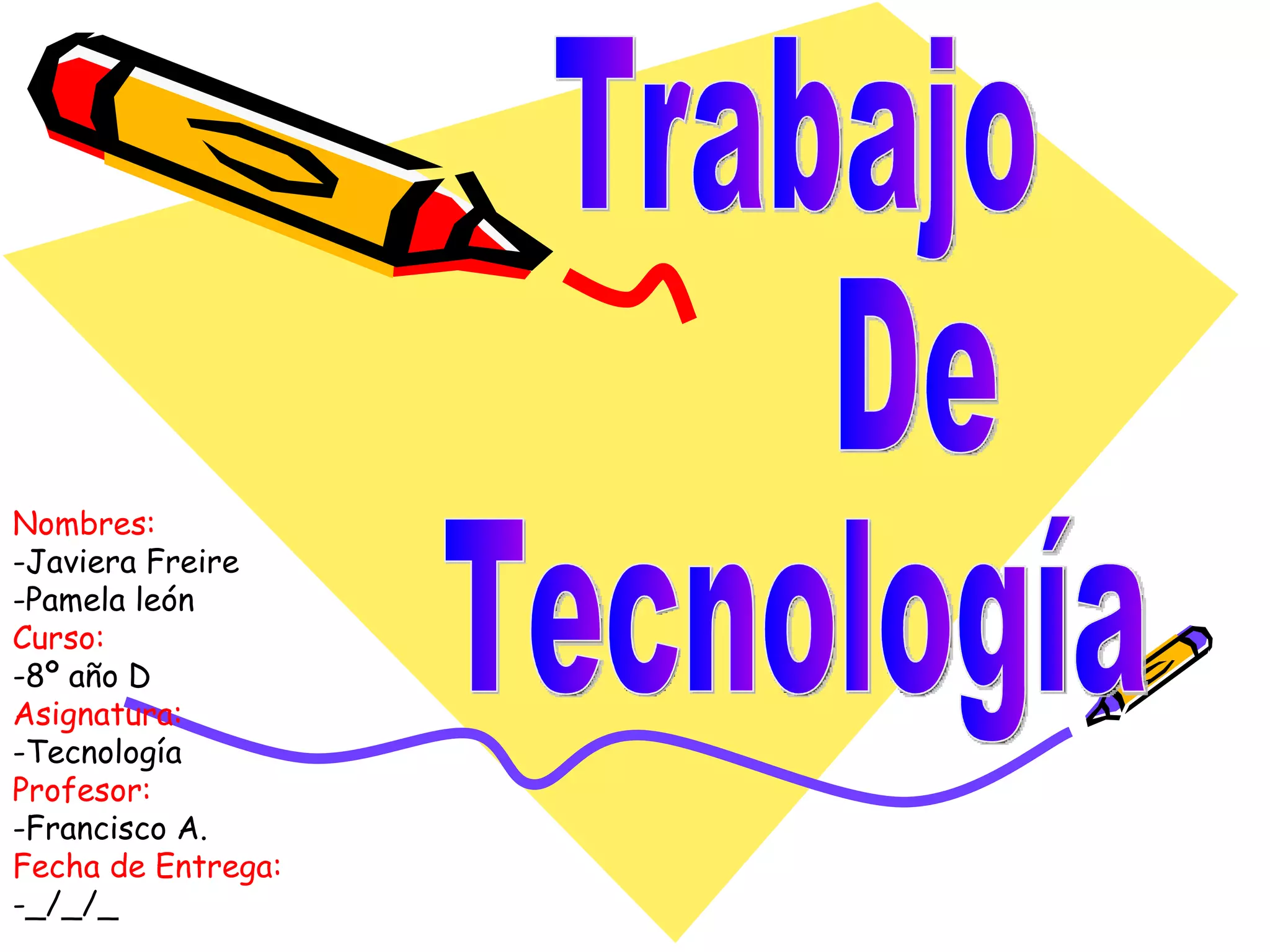 Este documento contiene la información de dos estudiantes de 8vo año, Javiera Freire y Pamela León, que están realizando un trabajo de tecnología sobre engranajes, poleas y biela-manivela para la asignatura de Tecnología con el profesor Francisco A.