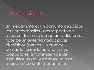 Este documento describe la diferencia entre mecanismos y circuitos. Los mecanismos permiten la transmisión de movimientos y fuerzas, mientras que los circuitos nos permiten generar, transformar o modificar señales eléctricas. También explica los diferentes tipos de componentes que se encuentran en los circuitos, como generadores, receptores, conductores y elementos de control, y las diferencias entre circuitos en serie y en paralelo.