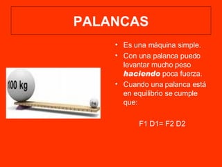El documento describe diferentes máquinas y mecanismos, incluyendo palancas, poleas, engranajes, y motores. Explica cómo las palancas, poleas, planos inclinados y otros mecanismos simples pueden usarse para mover objetos con menos fuerza. También describe varios tipos de motores, como motores de combustión interna, turbinas de avión, y cómo transmiten y transforman movimiento para propulsar vehículos.
