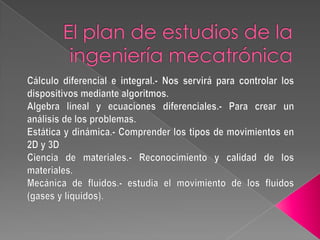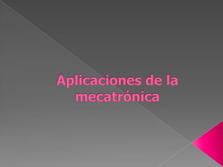 Este documento presenta un trabajo de técnicas de expresión sobre ingeniería mecatrónica realizado por un grupo de estudiantes. La ingeniería mecatrónica tiene como objetivo principal crear maquinaria más compleja y eficiente que facilite las actividades humanas, aprovechando su versatilidad al combinar varias ingenierías. Finalmente, se describen algunas de las aplicaciones actuales e investigaciones de punta de la mecatrónica.