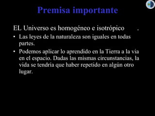 El documento discute la probabilidad de vida en otros lugares del universo. Argumenta que dado que las leyes de la naturaleza son las mismas en todas partes, y que el universo es homogéneo, es probable que la vida se haya desarrollado en otros planetas similares a la Tierra bajo circunstancias apropiadas. También menciona la ecuación de Drake para estimar el número de civilizaciones avanzadas con las que podríamos comunicarnos y los esfuerzos de SETI para detectar señales de radio de otras civilizaciones.