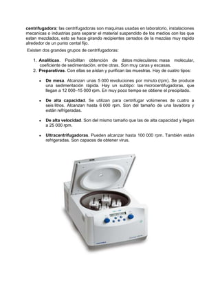Los documentos describen diferentes instrumentos de laboratorio comúnmente utilizados, incluyendo mecheros Bunsen para calentar muestras, centrifugadoras para separar materiales, microscopios para observar objetos pequeños, vasos de precipitado y matraces de Erlenmeyer para contener sustancias, balones volumétricos para calentar y medir líquidos, probetas y pipetas para medir volúmenes con precisión. Cada instrumento tiene un propósito específico en experimentos de laboratorio.