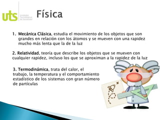 1) El documento describe varios temas de la física como mecánica clásica, relatividad, termodinámica y electromagnetismo.