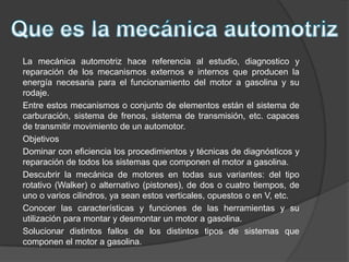 El documento habla sobre la mecánica automotriz, que se refiere al estudio, diagnóstico y reparación de los sistemas internos y externos que producen la energía para el funcionamiento del motor a gasolina y su movimiento. Entre estos sistemas se encuentran el sistema de carburación, frenos, transmisión y otros que transmiten movimiento. Los objetivos son dominar los procedimientos de diagnóstico y reparación de todos los sistemas del motor a gasolina, conocer las características de las herramientas y solucionar fall