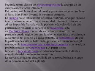 Según la teoríaclásica del electromagnetismo la energía de un cuerpo caliente sería infinita!!! Esto es imposible en el mundo real, y para resolver este problema el físico Max Plank inventó la mecánica cuántica. La energía no se intercambia de forma continua, sino que en todo intercambio energético hay una cantidad mínima involucrada. Al ser imposible fijar a la vez la posición y la velocidad de una partícula, se renuncia al concepto de trayectoria, vital en Mecánica clásica. En vez de eso, el movimiento de una partícula queda regido por una función matemática que asigna, a cada punto del espacio y a cada instante, la probabilidad de que la partícula descrita se halle en tal posición en ese momento (al menos, en la interpretación de la Mecánica cuántica más usual, la probabilística o "de Copenhagen"). A partir de esa función, o función de onda, se extraen teóricamente todas las magnitudes del movimiento necesarias. La teoría cuántica fue desarrollada en su forma básica a lo largo de la primera mitad del siglo XX.