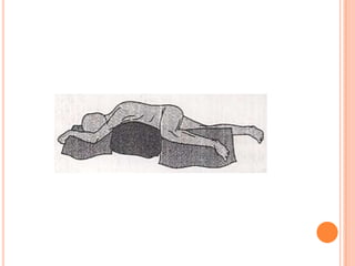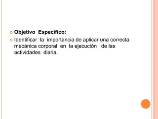 Este documento describe los principios de la mecánica corporal y las posiciones corporales correctas para pacientes. Explica que la mecánica corporal involucra el equilibrio coordinado de los sistemas muscular, esquelético y nervioso. También describe varias posiciones corporales comunes como la posición anatómica, decúbito dorsal, decúbito ventral, y sus usos respectivos en el cuidado de pacientes. Finalmente, enfatiza la importancia de aplicar estos principios para evitar lesiones y fatiga innecesaria.